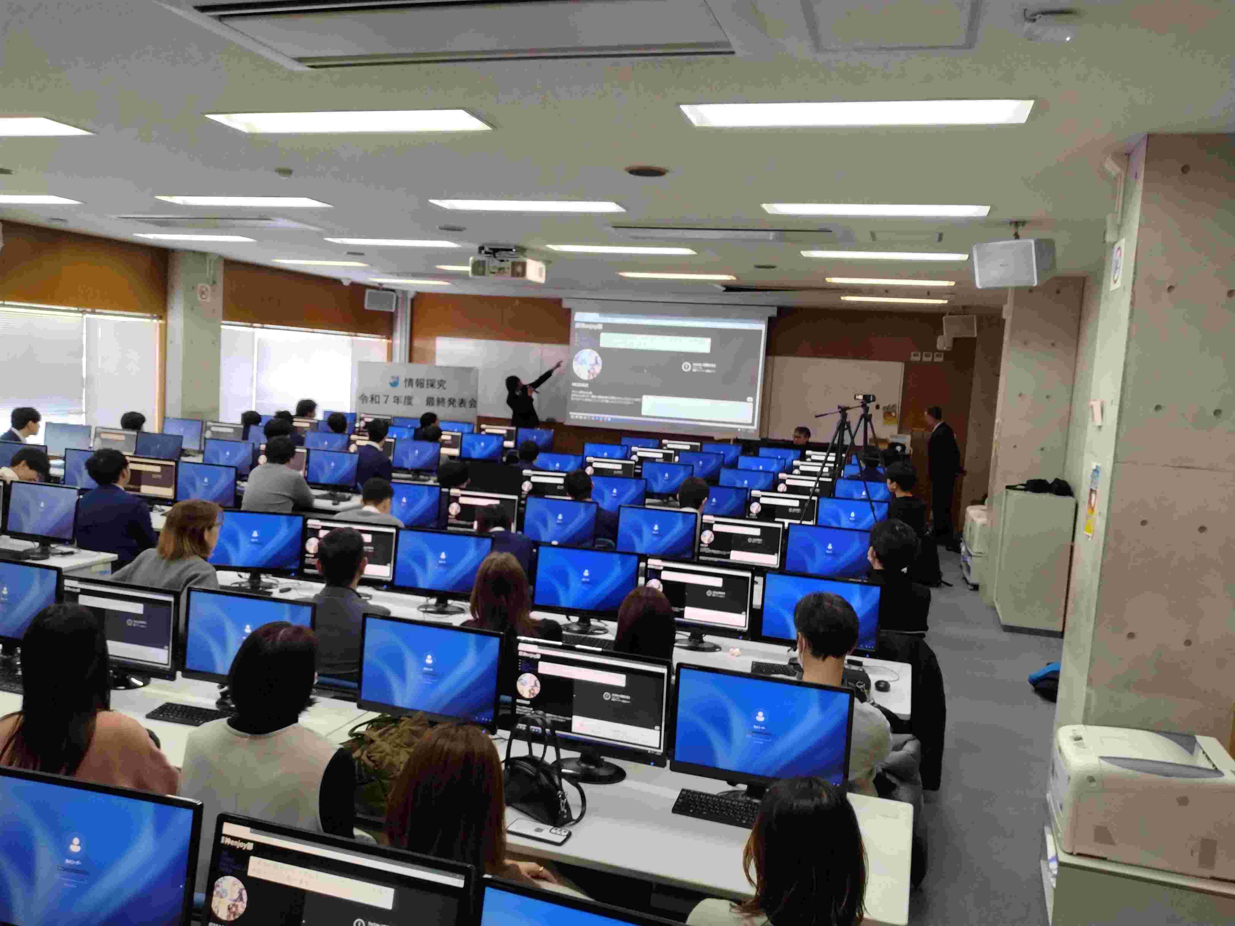 情報学部では、「JavaScriptで音楽を作ろう」「WEBプログラミング超入門」「人工知能技術に触れてみよう」「データ分析にチャレンジしよう」といったテーマで、一人ひとりが主体的に取り組んだ成果を発表しました。プログラムの仕組みをわかりやすく説明し、実際の動作画面を示しながら堂々と語る姿からは、この一年間の確かな成長が感じられました。専門用語を自分の言葉に置き換え、相手に伝わるよう工夫する姿勢は、まさに学びの深化そのものでした。