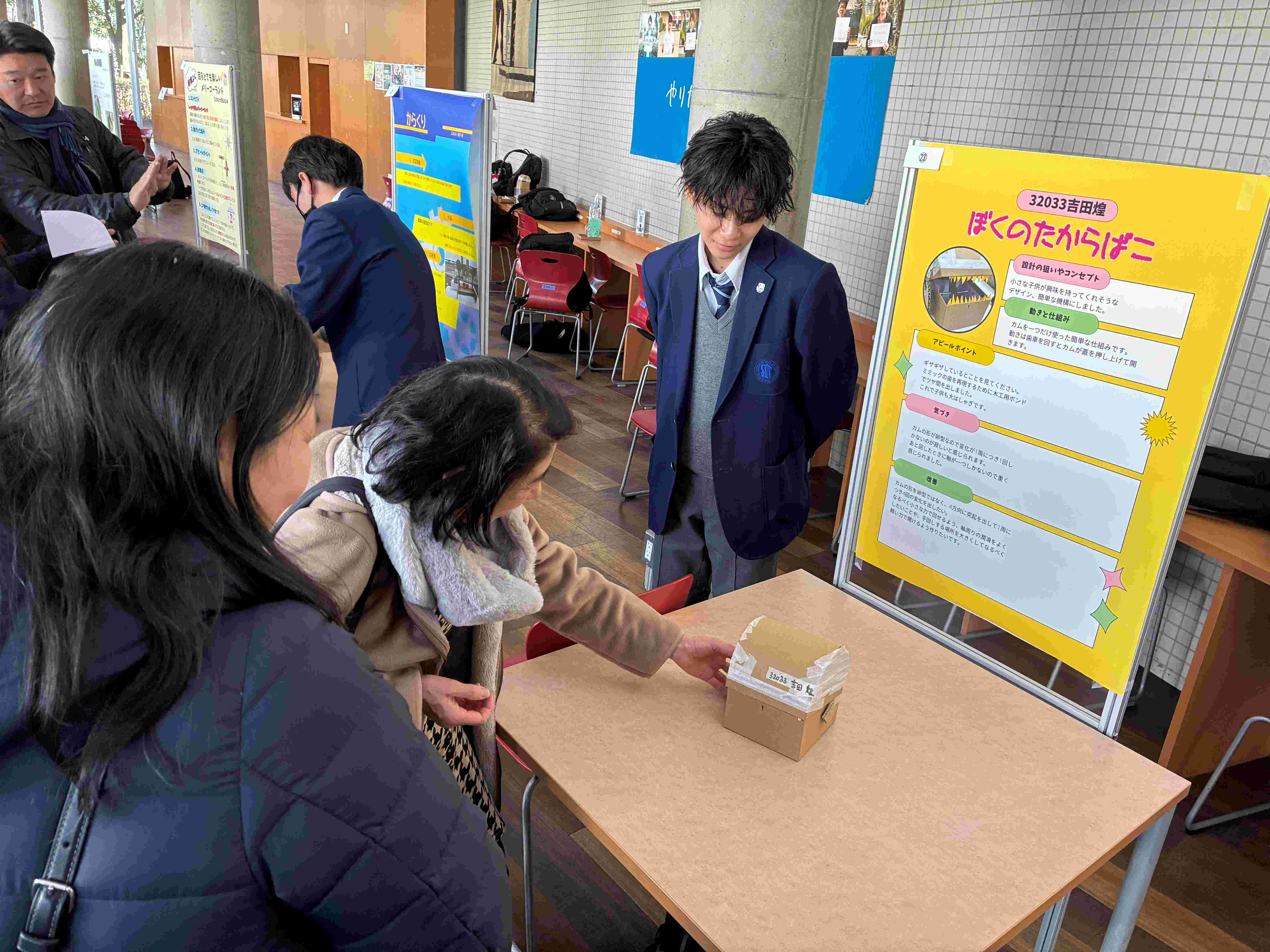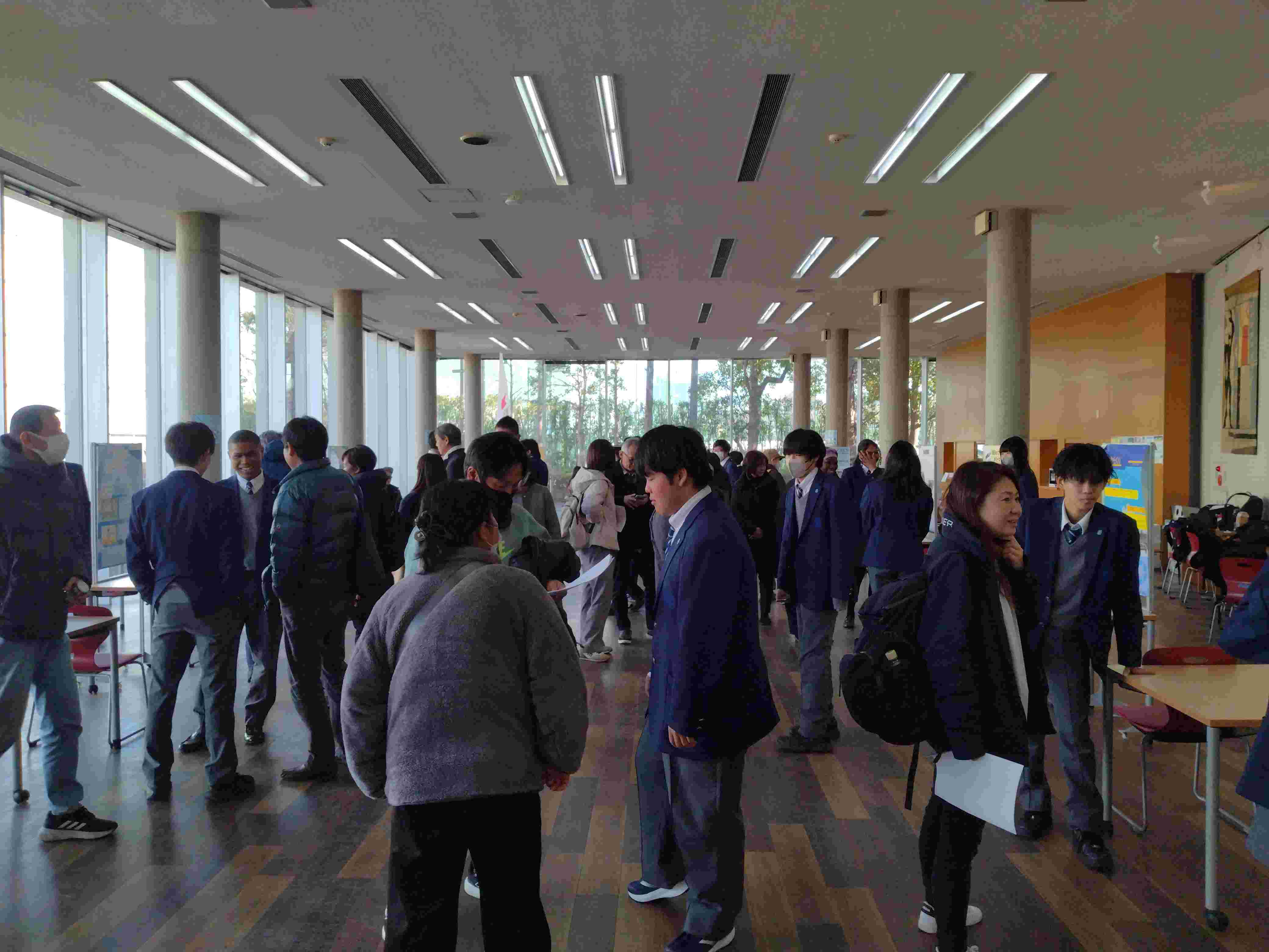また、ポスターセッションも大いに盛り上がりました。ロビーやコミュニティホールでは、保護者や教員からの質問に対して丁寧に説明する姿があちこちで見られ、双方向の活発な議論が展開されました。自らの研究内容を深く理解していなければ答えられない問いにも真摯に向き合う姿は、とても頼もしく感じられました。