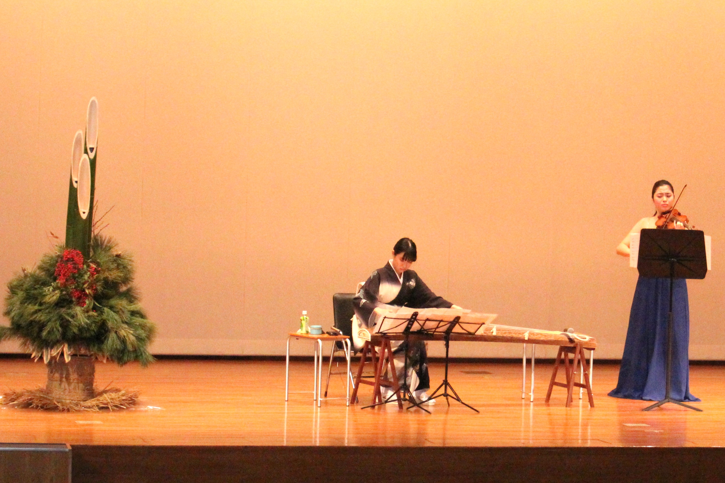 邦楽演奏会では、車折神社 宮司のご子女で京都市出身、東京藝術大学音楽学部邦楽科 箏曲生田流二年 知原佑実さんの素晴らしい箏の音からたくさんの「福振る舞い」を受け、また東京藝術大学で同じ京都市出身の同級生、藤戸愛さんのダイナミックなバイオリンとの共演もありました。
