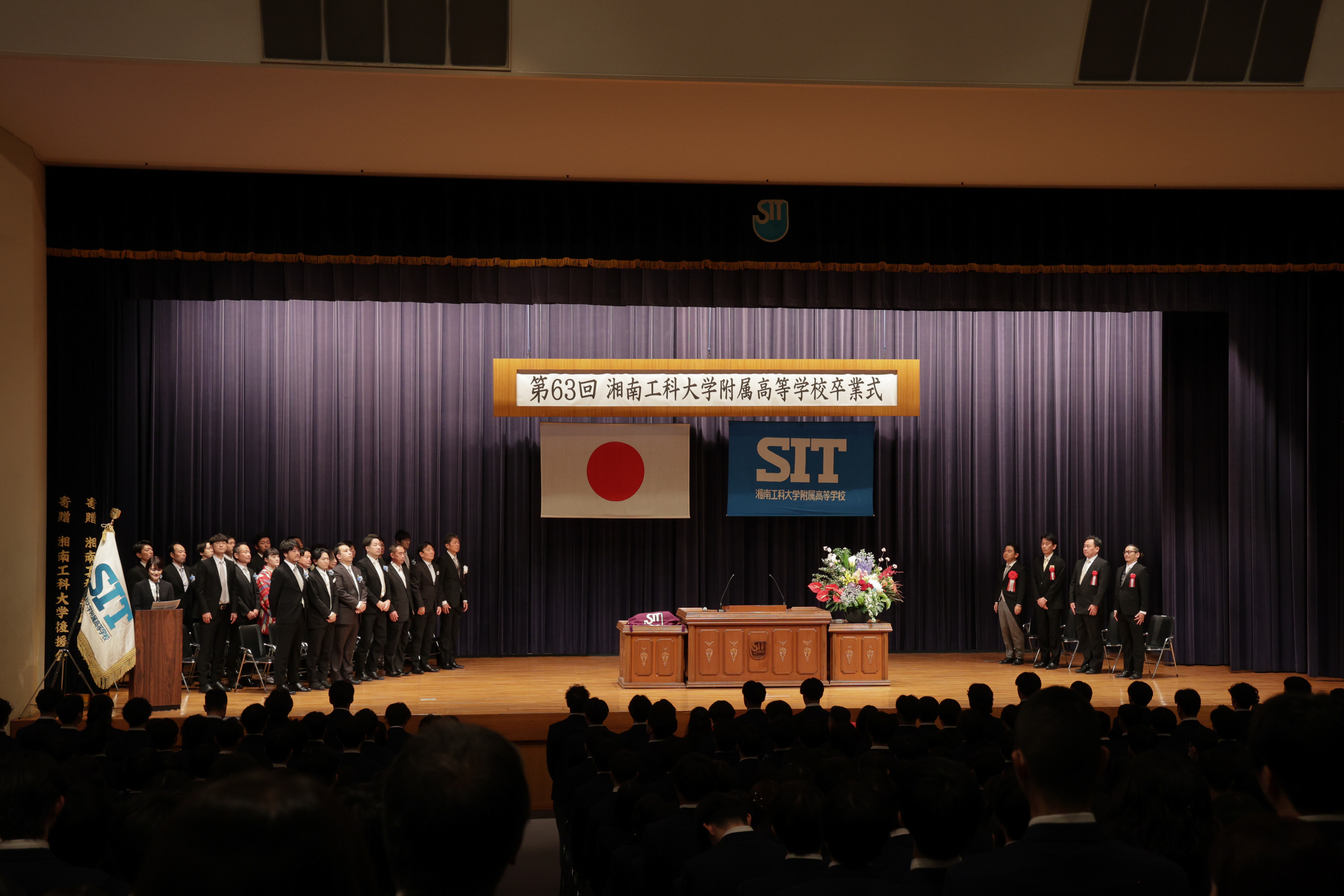国歌斉唱と校歌斉唱では、この春に湘南工科大学に入学を予定されているプロの歌手 東亜樹さんに歌っていただいた映像を流し、その素晴らしい歌声に聞き入っていました。また、東さんから卒業生にお祝いのメッセージを頂きました。