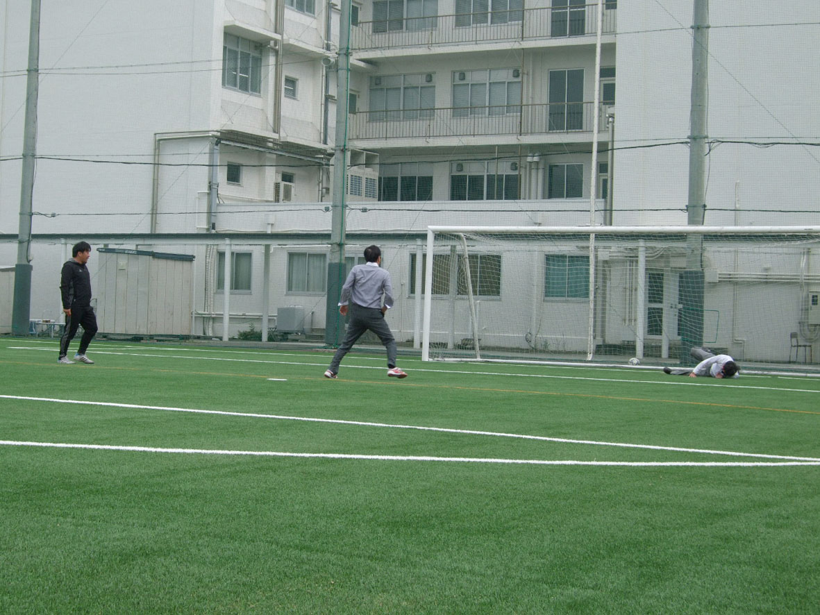 教頭先生をゴールキーパーに据えて、校長先生の鮮やかなキックがゴールを揺らしました。